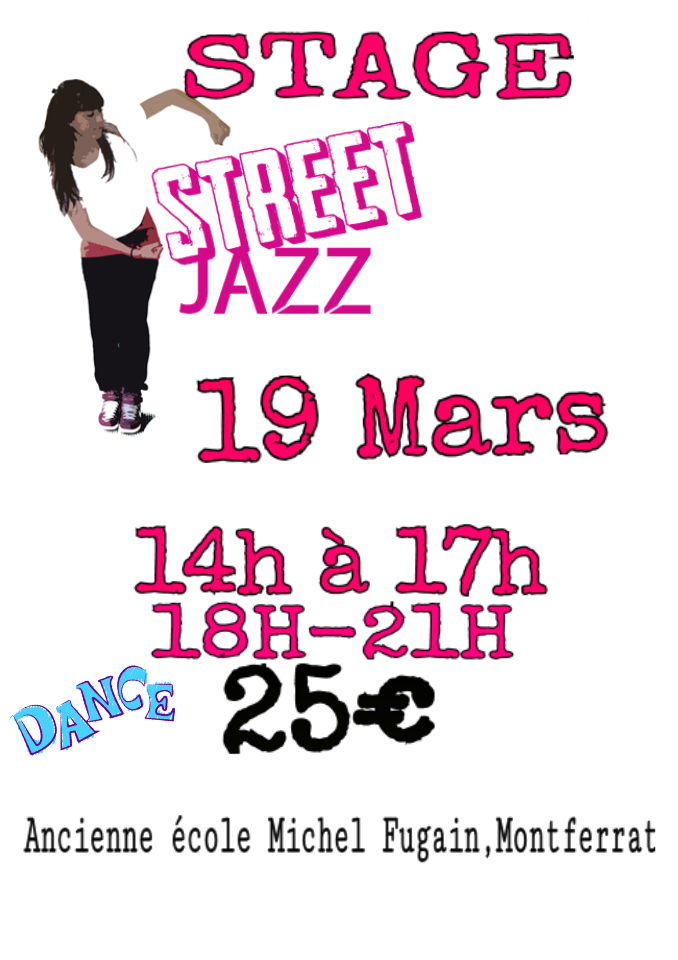 STAGE DE STREET JAZZ AVEC ANGELIQUE ! 3H intenses pour apprendre une chorégraphie sur WILL I AM, Ego, à l'ancienne école Michel Fugain à Montferrat ! 2 créneaux: de 14h à17h ou de 18h à 21h Tarif : 25€ par personne Réservation : 0642790313 ou sur FACEBOOK